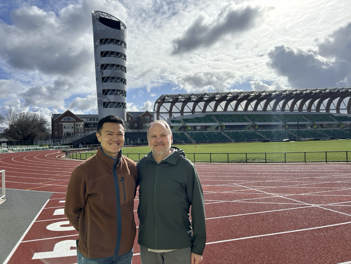 Professor Gaku Kakehata from Waseda University Faculty of Sports Sciences visited Professor Mike Hahn at the University of Oregon. The two are photographed at Hayward Field at the University of Oregon, home to the Bowerman Sports Science Center.